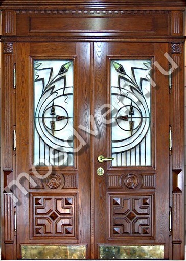 Парадная стальная двустворчатая дверь с резьбой по массиву, стеклом и ковкой — закажите уже сегодня! Позвоните нам, и узнайте точную цену в течение 15 минут. Выезд специалиста — по вашему графику!